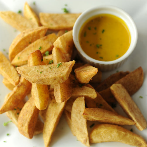 deep-fried seasoned potato wedges. side of honey-mustard dressing
