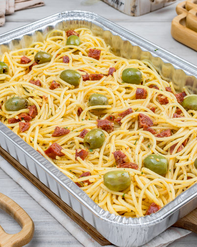 chorizo pamplona. green olives.garlic. extra virgin olive oil. parmesan. chili flakes