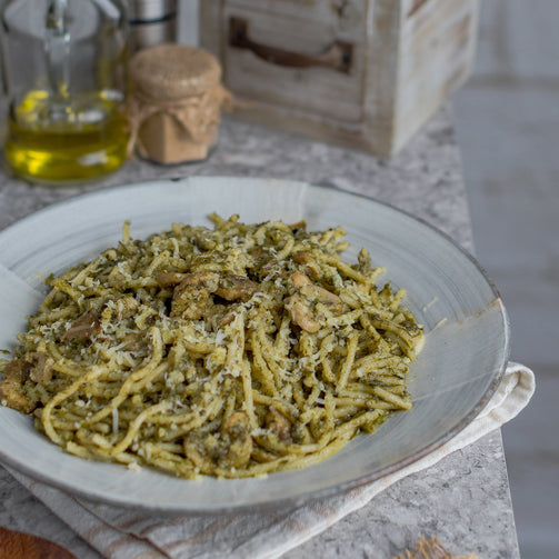 spaghetti, basil, pine nuts, mushroom, extra virgin olive oil, cream and parmesan