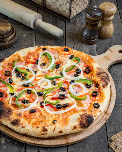bacon, ham, tomatoes, bell peppers, black olives, onions, mozzarella