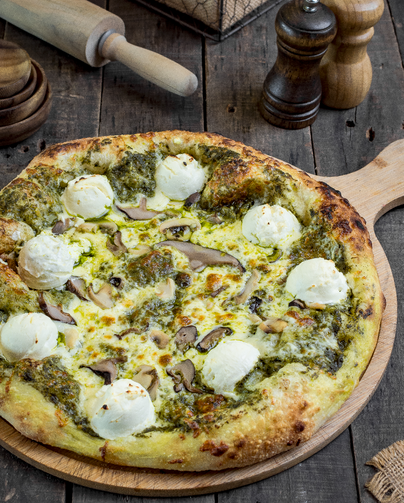 shiitake mushrooms. button mushrooms. fresh pesto. mozzarella